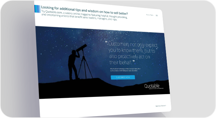 State of Sales Looking for additional tips and wisdom on how to sell better? 59 Try Quotable.com, a weekly online magazine featuring helpful, thought-provoking, and entertaining articles that benefit sales leaders, managers, and reps. "Customers not only expect you to know them, but to also proactively act on their behalf." Why You Need Technology to Make Concept Selling Work by Tony Owens | EVP, Enterprise Sales, Salesforce SUBSCRIBE NOW Salesforce Research