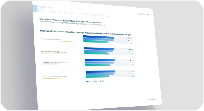Appendix State of Sales 40 Sales Teams Shift to Match the New Customer Mindset Sales teams are focused on alignment around changing customer expectations. Here we see the percentage of sales teams who say their company has achieved alignment. Percentage of Sales Professionals Say Their Company Is Completely or Mostly Aligned on the Following by Business Type 67% 67% Changing customer expectations 54% 66% 63% Resources needed to engage customers 53% 65% Importance of cross-team collaboration 63% (sales, marketing, service) 53% 64% 61% How to empower sales to exceed goals 50% B2B2C B2C B2B Salesforce Research