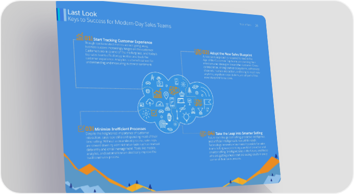 Last Look State of Sales 26 Keys to Success for Modern-Day Sales Teams | Start Tracking Customer Experience 01 Though quota-related metrics are not going away, business success increasingly hinges on the customer. 02| Adopt the New Sales Blueprint Customers are in control of the marketplace, and today’s A new sales approach is required to lead in the top sales teams effectively prioritize and track the Age of the Customer. Top teams are pivoting their customer experience. Analytics is a beneficial tool for mindsets and strategies toward the customer. Cross- understanding and measuring customer sentiment. collaboration, strong partner ecosystems, self-service channels, human interaction, and rising to meet new anytime, anywhere expectations, are all part of this new blueprint for success. 03| Minimize Inefficient Processes Despite the heightened importance of customer 04| Take the Leap into Smarter Selling interaction, sales reps still aren’t spending most of their Future tech like guided selling, predictive intelligence, time selling. Without a streamlined process, sales reps and artificial intelligence is now within reach. are slowed down by administrative tasks such as manual Technology innovation has made it possible for sales data entry and email management. Tools like mobile, teams to begin experiencing a world of proactive and analytics, and automation can drastically improve the smarter selling. Intelligent sales is the future, and those traditional sales process. who are getting a head start are seeing results in every corner of their sales process. SalesforSalesforcce Re Researesearchch